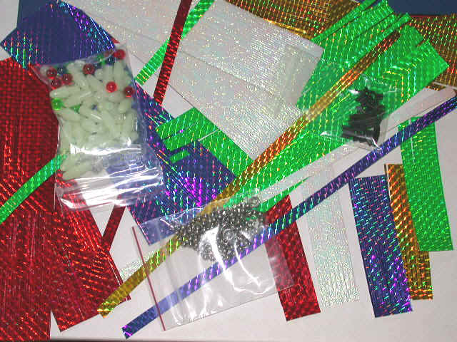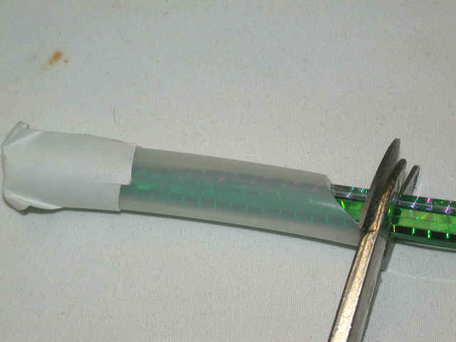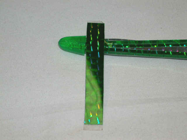 Dividing the Mylar that already has the double faced adhesive. 2. Two pieces of fringe tape, soon to be four, you'll need to peel off this backing. 3 . Enough material to do 4 attractor flies 4. Circumference of bullet is 3/4, DO NOT precut the Mylar fringe to this size. |