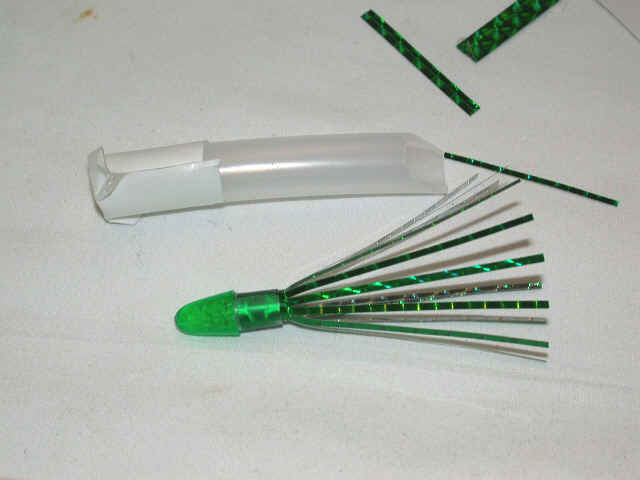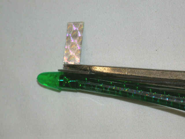 I trim the cutting tool at a 45 degree angle, this is optional. 14. Overall measurement of my cutting tool is 2 & 3/4 inches 15. Trim attractor fly to the correct length 16. Snipped off Mylar fringe tape |