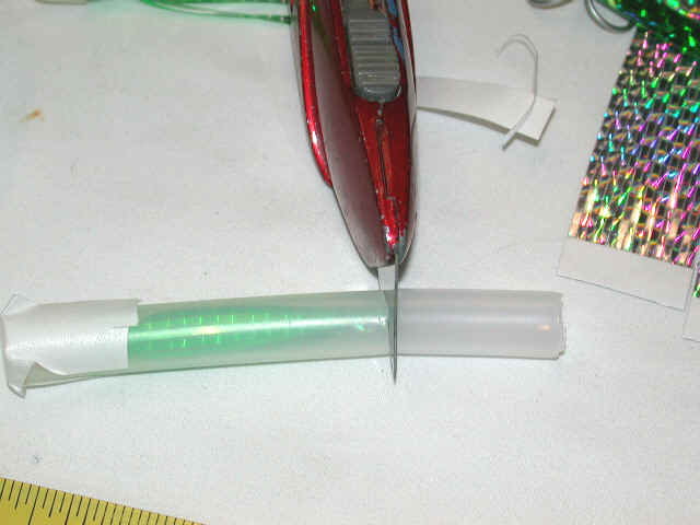 Look closely at this photo. This is a "stock in the package" brand new twinkie fly, it's starting to separate slightly, with some double-faced tape stuck on it. This will not happen if you wrap the collar tape with an overlay of scotch-tape. 10. Overall length is around 2 3/4 inches and this photo features your guide tool for making all your flies the same length. I prefer 3 inches from the tip of the bullet head to the end of the fly, many use 2 1/2 inches too. So, use the length your like. 11. Tape over one of the measuring tool. Trim off at what you want the length of the fly to be ( 2 & 3/4 inches). Please keep in mind this is not rocket science and a little shorter, or a little longer is perfectly is O.K. 12. Trim cutting guide tool to preferred distance. Although you'll have to trim this tubing to size, it will insure a pro job in all flies being uniform. |