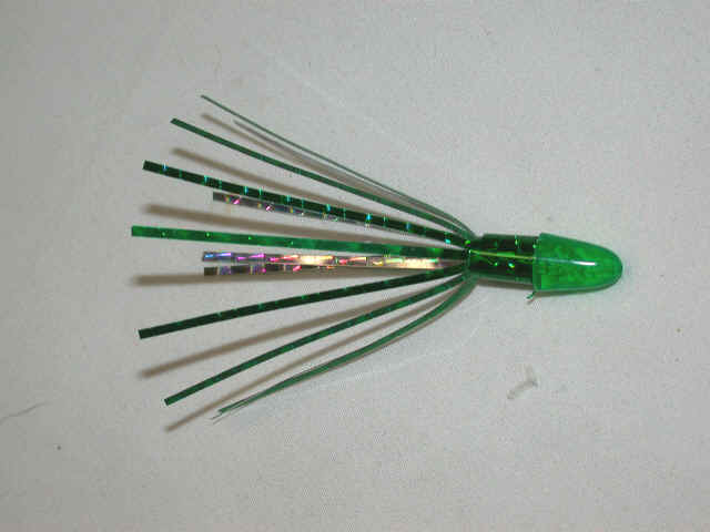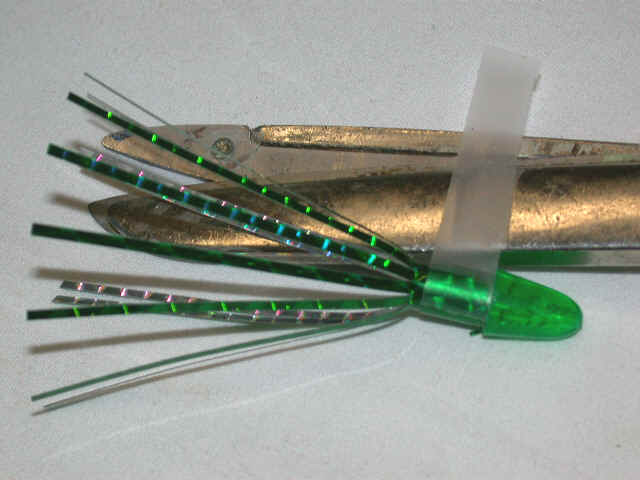 chains, crimps are available in my hardware kit. 4. A simple clinch-knot is the easiest to tie, I use a Trilene knot and moisten 5. Use Cortland's "Bite Guard" Hard Mono to make your meat rigs. This special leader material holds up far better than any regular mono line we tried. 6. The collar Mylar collar, or over-wrap tape adds a finished professional look. Then to keep the collar tape from lifting, use a 1/4' piece of clear (non-frosty) Scotch Tape. This 1/4" specially cut clear tape is available in my hardware kit. 7. This is not rocket surgery, or brain science. A little off here, or there ain't gonna make one iota's difference to the fish! 8. Make sure your skirts are bloused out and separated, especially before you set lines. By not having the Mylar pinched against the leader, this frees up your meat head. 9. There is no wrong way to do this, so don't worry about a inch here, or a 1/4 of an inch there. The fish do not carry a measuring tape. |