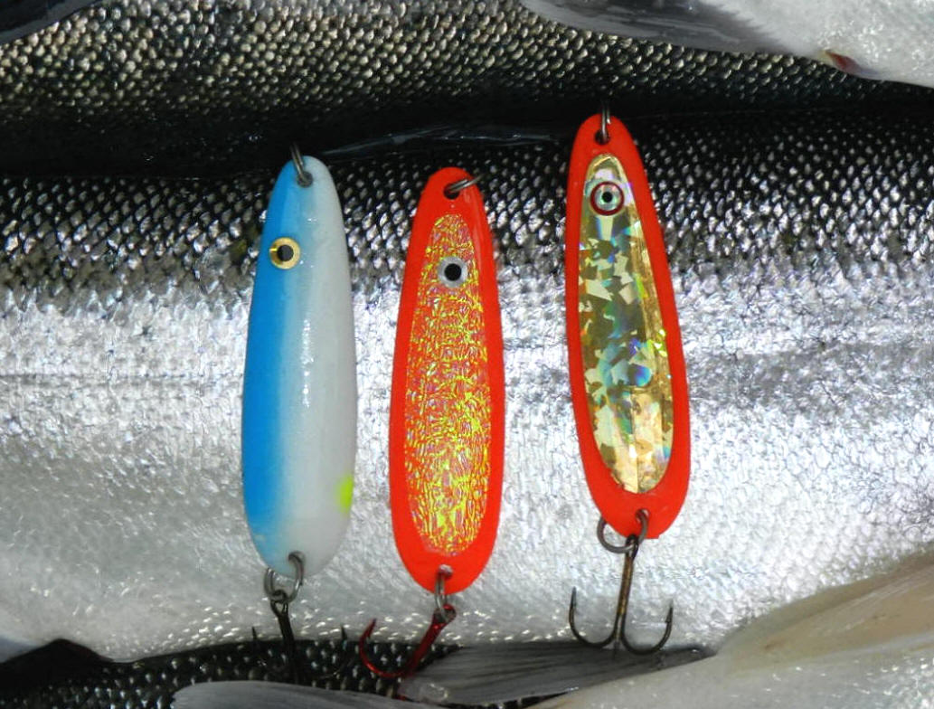 The back-story for this video begins with all test sessions out of the Port of Manistee, MI in April of 2015. This is shoreline trolling in water that's mostly from 6' to 12' deep just off the beach. Also, it was the 1st time I had the chance to use my just introduced Salmon Buster™ spoons. From many years of past experience knew what colors worked in stickbaits. But would the already proven colors be transposed into spoons? This was a brand new unexplored territory for me. More, or less a blank slate that was reel-fascinating with lots of challenges. Tactic was the big boards on 100' to 150' leads, or how far back. A little lumpy, a 100' is good to go. The calmer it was, the more the lead length increased. 1/2 oz Bead Chain Swivel weights were used on all the rods and plain Duo-Lock snaps. Line was mono in 15# test. Troll speed varied. Caught fish with my spoons from below 2 mph to over 3 mph. Sweet spot was discovered at 2.5 SOG on the GPS. Water temp fish were caught in ranged from the high 30s with ice on the pond on 4/1/15 to the mid 40s by the 2nd week of April. In 2015 weeds were a major issue. High water and storms washed a lot of shore grass and roots into Lk. MI by mid April. |