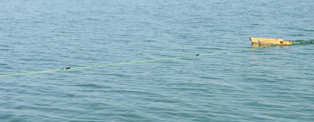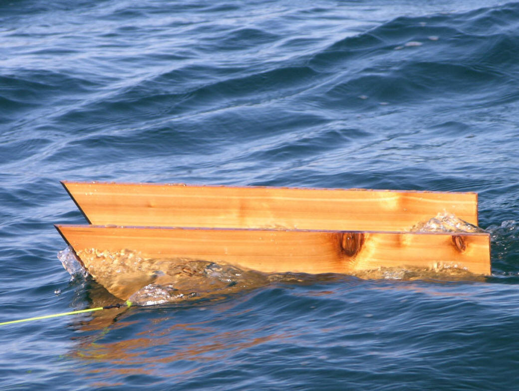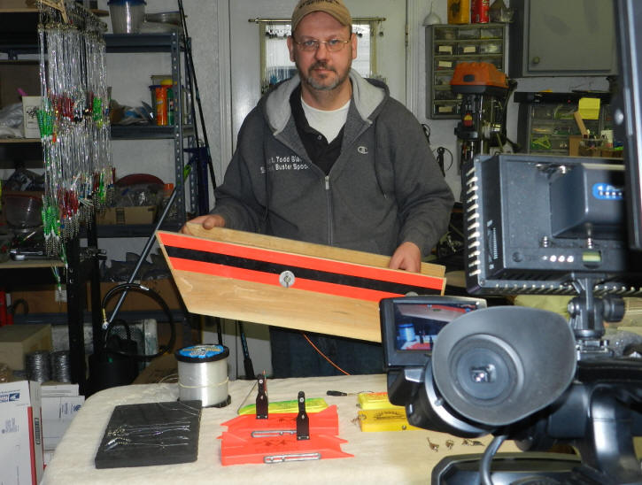 From a cost standpoint, making your own big boards is a heck of a lot cheaper. Price point on inlines in 2016 ranges from 30 to 50 bucks per inline board. If you choose to make your own, I found cedar to be the best. Problem with cedar planks purchased at lumberyards is cedar rough sawn on one side. You'll need access to a power planer to shave the rough side down. In the photo at the top of this page titled, "cedar is best" you can see how high cedar rides in the water. The buoyancy cedar provides pulls like a dream and out performs any of the commercial collapsible big boards being marketed. There's a pile of recipes for big boards on the internet that can be found by doing simple web search. On DIY boards, remember the closer to the front of the board, the easier it will tow. Have at 3 pull point holes to adjust for heavy duty towing on 300'-450' coppers, or lead cores. Salmon Buster™ Spoons with Birds, or Big Boards? Up until the introduction of my game changing Salmon Buster™ Lexan™ plastic spoons in 2015, the little, or inline boards had a leg-up. Little boards (inlines-birds) are known for imparting an enticing herky-jerky, variable, back and forth jigging action to the bait. From what I learned in 2015, my patent pending spoons have their own erratic jiggle-wiggle, lifelike movement built in. So far, from what I've seen, Salmon Buster™ spoons perform equally well on both kinds of boards. I will be running more side by side inline vs. big board tests in 2016. At the penning of this article in late 2015, both kinds of boards worked about the same. Board Lead Distances There's no one size fits all for the big boards, or birds (inlines). Conditions dictate this. Not a set rule written in stone. Flat water, big boards, had to go back 150' in flat-calm water. Ripples on glassy water worked at 125', or a slight chop seen a 100' work just fine for early season Browns. Number lines of lines that can be run off big boards is up to 6. Nowadays, being a sport fisherman, 3, or 4 per side is my normal spread. Inline boards leads will be closer. Due to the natural fall back of the board. 70' to 100' most of the time. In building rough water with whitecaps, I've had to knock down from 4 birds a side, to 2 and kept them close to the boat. Seen several times the little boards off the side only 25' from the boat on a 30' lead back take fish in water we really shouldn't have been fishing. Yes, these fish hit that close to the boat when the seas were running at 4 and 6 foot Ran as many a 5 inline boards per side in the perfect circumstances. But 4 per side was a normal program back when I chartered (1983-2003). It's very important to remember, rough water and boards don't go together. Big boards can flip over and dive for the bottom like a Dipsy Diver. Only fix is to go dead-stop in the water, let the board float back up. Then, pull in a jumble of tangled lines all wrapped together. Little boards cause issues too. They jump over each other, then ...it's a wrapped, over-under rod tanglement. It's a good move on your part to know how to fish both inlines and the larger boards. Both types of side planer devices have their strong points. Making them valuable tools in your fishing arsenal. You spread can troll a path the best part of 200' wide when boat traffic is light with boards, or birds. That's a lot of surface area to cover! Important: Above all, remember to let the fish drift back after the hit. This comes from not being in a big hurry to power skate the fish back to the boat. You need clearance, or you're going to have a mess of lines tangled together. Line tangles are a waste of valuable fishing time. Keep all board lead lengths the same, or you'll be shuffling lines all day to eliminate lures staggered at various distances. Having all lines having the same length per side, makes your turns a lot less prone to tangling.