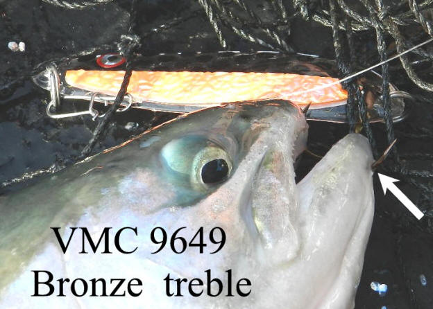My Hook Credentials My education on round bend hooks began sometime in the 1960s when I bought my 1st floater jointed Rapala. I had yet to fully commit to big water Salmon fishing and was back and forth between Bass and Lk. MI Salmon. Awareness taught me, seldom did I miss a fish on the jointed stickbaits with a hook that I was just learning about. Fast forward to the mid 1980s when I began guiding on the Big Manistee River out of a a drift boat. Preferred diving crankbaits at this time was Storm Wiggle Warts that came stock with tiny #6 trebles that were totally inadequate of hooking and holding hard fighting river Steelhead. This when my love affair with #4 VMC bronze 9649s took on a whole new meaning, because these trebles installed on Wiggle Warts hooked and held. Meaning more boated fish for my paying guests. In the charter-guide business you become skilled at compensating for your customer's lack of rod handling skills. You must accept as a charter operator lost fish are part of the business. If your guests knew what they were doing? ...they'd have never hired you in the first place. So, you look for every advantage to raise the odds in your customer's favor. 9649s made my professional life on the water easier! Armed with my mid 1980s knowledge from river guiding, it was a no brainer to adapt bronze round bend trebles on the Great Lakes. Mostly on Bomber Long-As ...that was the big-time craze on Lake Huron back then. It was an eye opening event to see 80% landing stickbait ratios with inexperienced charter guests. It irks to me hear dockside yak, "we went 16 for 30." Like there's a red badge a courage dummy award for losing close half their bites. This is an admittance of not being smart enough to capitalize on a higher percentage by taking appropriate steps to cure this problem. The fix is the right hook for the right circumstance. Then, making sure it's sharp and maintained as needle sharp. Especially, after landing a good size fish when the hook came in contact with bone structure. This can dull any sharp point. Even worse, roll the point over. Be aware most hook damage occurs in the net. Before resetting the lure that just caught, do a quick visual of the hook. Make sure it's not bent, or straightened out. These few seconds will reward you many times over. Hooking Up on Surface Fish