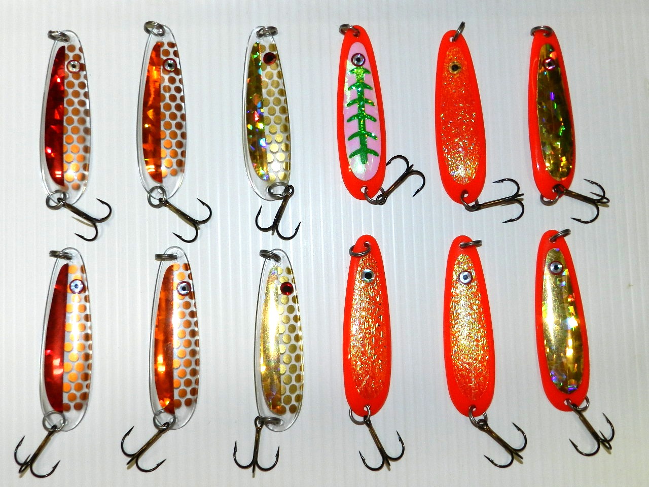 www.michiganangler.com/Salmon_Buster_Spoons For those of you that use my spoons, you already know these lighter Lexan™ spoons remain stuck fast to the fish during jumps. Salmon Busters™ are half the weight of traditional brass plated spoons. This reduction in mass, results in a lure that's a lot harder for Steelhead and Brown to toss back at you. Here's another reason: being my hooks are a full size larger when compared to their counter parts from other spoon manufacturers. My upsized VMC treble hooks dig in better & hold. No brag, just fact! Plus, my spoons do not get bent out of shape, or kinked. You're looking at a spoon with injection molded in color. It will look the same after many, many years service. There's no planned obsolescence in my product. Silver plated metal spoons need replacing when the paint peels and silver plate tarnishes. Add in my years of fishing Lk. Huron, Lk. Erie and Lk. MI since 1968 means something too. All this experience provides a historical treasure trove a proven colors and patterns. Knew going in, all the pitfalls and short comings of metal spoons. That's why I designed my 2015 spoons to made out of Lexan™. The world's strongest plastic! Click for the Reel-Story of Salmon Buster spoons Ready, Set, Go!