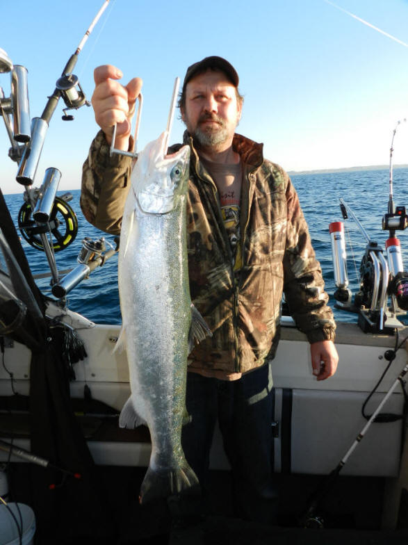 www.michiganangler.com/2013_New_Tackle.htm First set of the trip, you might have to help the line go out by pulling line off the spool by hand. After the mono is thoroughly wet, re-setting lines is a heck of a lot faster and easier as water drag takes over. Once mono becomes saturated, it's a lot faster to let out a 100-125' of line with the help water drag, wet line provides. Specific gravity of monofilament changes when it gets wet. This can effects how deep your lure/spoon goes too. You'll notice the added water drag of wet mono second time you reset lines. Let's talk about time efficiency. Say you have 2 persons aboard, MI regulations say you can use 6 rods. That means 600' to plus 700' of string that needs to be played out. Depending on how far you're dropping your lures back. If you're using big boards? There's the task of sliding the line down on the tag line ...out to the planer board. It's big help to have boat speed on the hot side to create more water drag. Always keep the lines being set separated & work with your fishing partners as a team. Setting Lines OK, now that you're armed with a pile of knowledge. Let's take it a step further and fine tune setting lines. This begins with a quick visual to make sure the lure is working, not fouled when it first hits the drink. If you're using the "big" boards and not inlines, it helps keep the boat speed on the hot side. Let's say, your desired troll speed is 2.5 mph, Bump up the speed to 3.5 mph to get lines in the water faster. It takes too much time to let out 100-125' of line, hook it to a release, then clip it to the planer tow line, get it to side down the tag line, if you're on the slow side. The faster your spread is set, the quicker the party begins. A word of note: my preference is the big boards. But this is a matter of personal preference, because I rather go direct drive to the fish and not have an inline board to deal with. Done it both ways and this depends on what you're most comfortable with. "Used to be," inline planers would produce more fish due to the little boards imparting more lure action as they skitter along. The game changer is my Lexan™ (plastic) Salmon Buster™ spoons that have their own erratic action built in. There's no metal spoon on this planet that darts, dives and changes direction like mine! Click a video that proves this reel-fact! If you're using the "big" boards, make sure to use 200# test planer board line and NOT the 130-150# test that comes standard on most planer board reels. Breaking a board off is big time grief and causes lost releases and a mess from hell. After a few seasons, reverse the planer board cord. Put the used stuff on the bottom of the spool. Reversing planer tow line brings newer, unused line on top. Fluorocarbon, or Monofilament Line? In most cases this is going to be clear open-water trolling with the exception of April shoreline trolling for Brown Trout. Nix the 25-30 pound test goat rope used for attractors and consider 15# test. You can get by with 20# for a mainline, then tip down to 15# leader from the keel sinkers I highly recommend to the spoon. Fluorocarbon can be a great choice for those believing it's invisible to the fish. Personally, I don't know. But if the hype is true, but anything that adds confidence to your program? ...go with your gut. Caught with both regular mono and fluoro and can't verify one works better than the other. Wind resistance is another factor that influences the line you use. The thicker the line diameter, the harder it is to get the line to slid down the tag line of larger boards. Wind effects inlines too, but to a much lesser extent.
