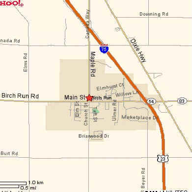 a large mall. If you're coming from the north towards Birch Run, exit at the Birch Run. The general location of Birch Run, MI is north of Flint and south of Saginaw MI. It's easy to find, being just off I-75/US23.