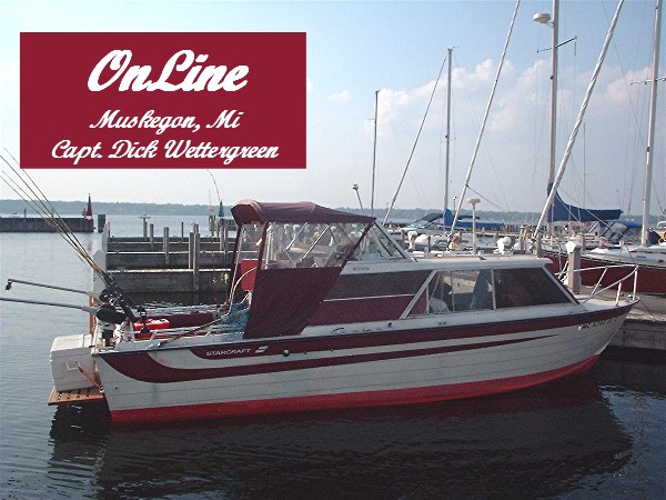Capt._Dean_n_Dale.jpg (49964 bytes) Home Port: Grand Haven.  Our 1975 21 ft SlickCraft is equipped with 4 downriggers, 2 Penn manuals and 2 Proos electrics. Along with 6 Titelock rail mount holders that will be added this year and 2 pursuits dipsy holders. Riggers are all on pursuit tracks. 13 rods and reels. Brand new custom canvas just made. Lowrance X-65 finder, Uniden VHF.  She will be slipped in the Warf marina in Grand Haven in 2004...Captn's Dean & Dale