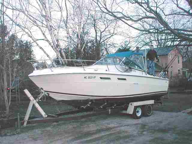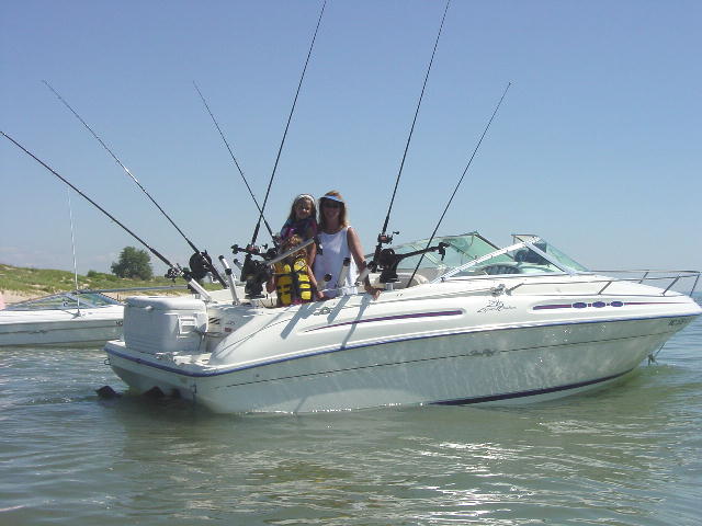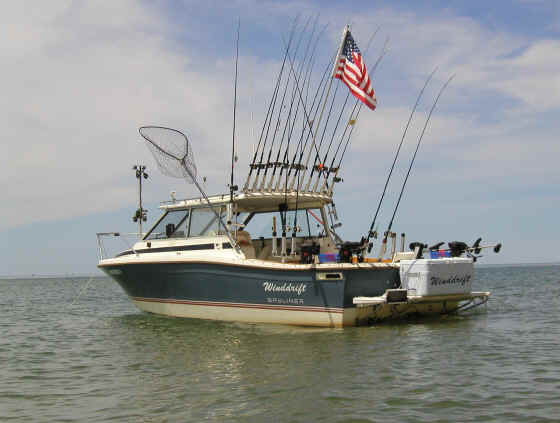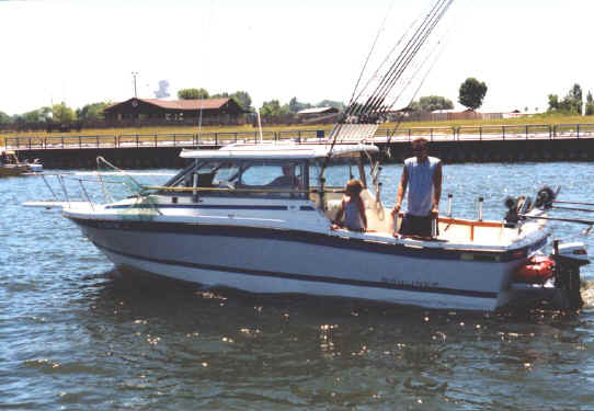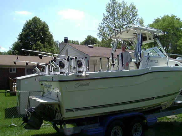 My boat is a 25' 1990 Sea Sprite  Cuddy. The picture is before I added 2 walker temperature sensor electric downriggers and two regular walker electric downriggers. The electronics include a Lowrance 3000mapplus and a Raymarine L750 fish finder. I also have added 18 rod holders in various positions. The boat itself has one in floor live well and raw water wash along with a nice cuddy complete with refrig, stove, and AM/FM Cass. 175 Merc and 15hp Merc kicker.