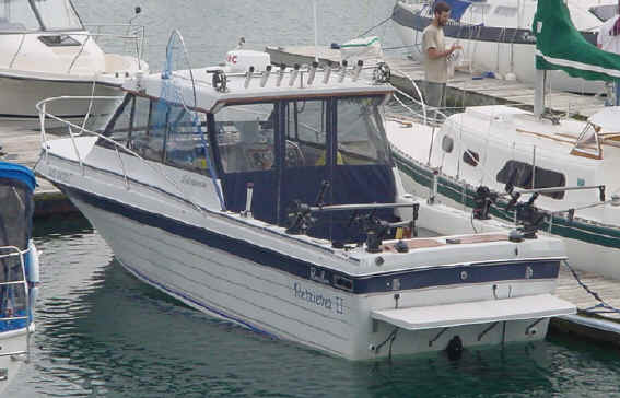 Retriver_2.jpg (29061 bytes) The "Retriever 2" is a 1989 24' Penn Yan Contender with 5L Mercruiser and comes equipped with Furuno color 582L and Lowrance X85 fishfinders, Lowrance Globalmap GPS, JRC 1500 radar, FishHawk 840, Icom VHF, 4 Cannon mag 10's, Flo-jet fresh water washdown, Raymarine Sportspilot autopilot and a 5 blade SS prop for extra traction. Most important feature is that the boat has ' good karma ' for catching fish.
