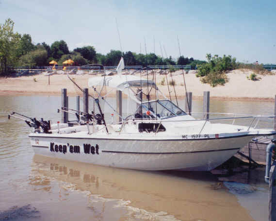 Keep_em_Wet.jpg (27206 bytes) The Keep'em Wet is a 1992 22 foot Aquatron with a 305 Mercruiser I/O. Equipment list includes 4 Cannon electric downriggers with 12 rod holders, 7 Big Jon adjustable and 4 Tite-lok rail mount rod holders, Raymarine L750 fish finder, Lowrance Global 3000 GPS, Fish Hawk 840, VHS radio, Sportpilot plus autopilot, CD player, wash down pump, trim tabs, full canvas enclosure. I fish out of Lexington, HB, and Oscoda with an occasional trip to Ludington, Manistee, and TC. The photo is before I added the extra Big Jon and Tite-loc rod holders.....Capt. Larry Skellett