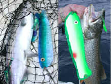 "Hi John, Today's report (7/20/04) is improved from the weekend, good but not excellent. Caught 8 kings and one laker on flies and cut bait with the "Reel Flasher."