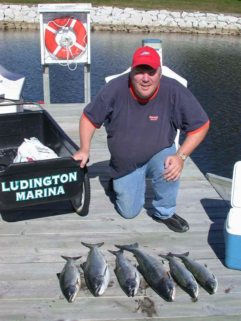 10/11/04 Capt. Bob Hicks was sporting enough to invite me for a morning of catching yesterday. We fished out of Bob's home port of Ludington, Michigan. Ludville is known for extraordinary Salmon fishing and once again this popular port lived up to it's billing. We had 12 strikes, boating 8 pubescent