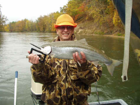 introduced to Lake Michigan and propagated to the rest of the Great Lakes soon after. To verify my data click here to confirm the above dates. 10/21/04 Good news could lay a couple of seasons down the road on the Steelhead scene from what I'm hearing. The diehards that are still pounding the Lk. Michigan off Manistee are being plagued by huge numbers of skipper Steelhead. Skippers are immature fish from 12 to 16 inches long and are about 2 years old. These baby Steelhead are called skippers, because the skip (leap, or jump) all over the surface in an effort to extricate the hook. So, a couple of years down the pike, Steelheading might be on the major improve for the big water and river anglers. 10/20/04 My prediction of success on the Big Manistee river is well formed, because of all the rain we've had. After almost drought conditions in August and September, lots of rain has been the story from Manistee County for about the last week. Rain increases the flow and draws fresh Steelhead in from Lake Michigan. These reel-fresh run fish are dumber then a stump and easy to catch. Unlike spring spawners, fall iron-noggins are super aggressive. These villainous creatures are ready to whack your offering hard. In fact, fall spawn dunkers experience hard hits and can have their rod almost yanked from their paws. This seldom, if ever happens during the spring run. Spring fish as a rule won't go out of their way to hit and need to be bumped in the snout to trigger strikes. Fall Steelheading is a favorite with me!