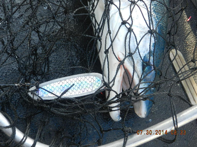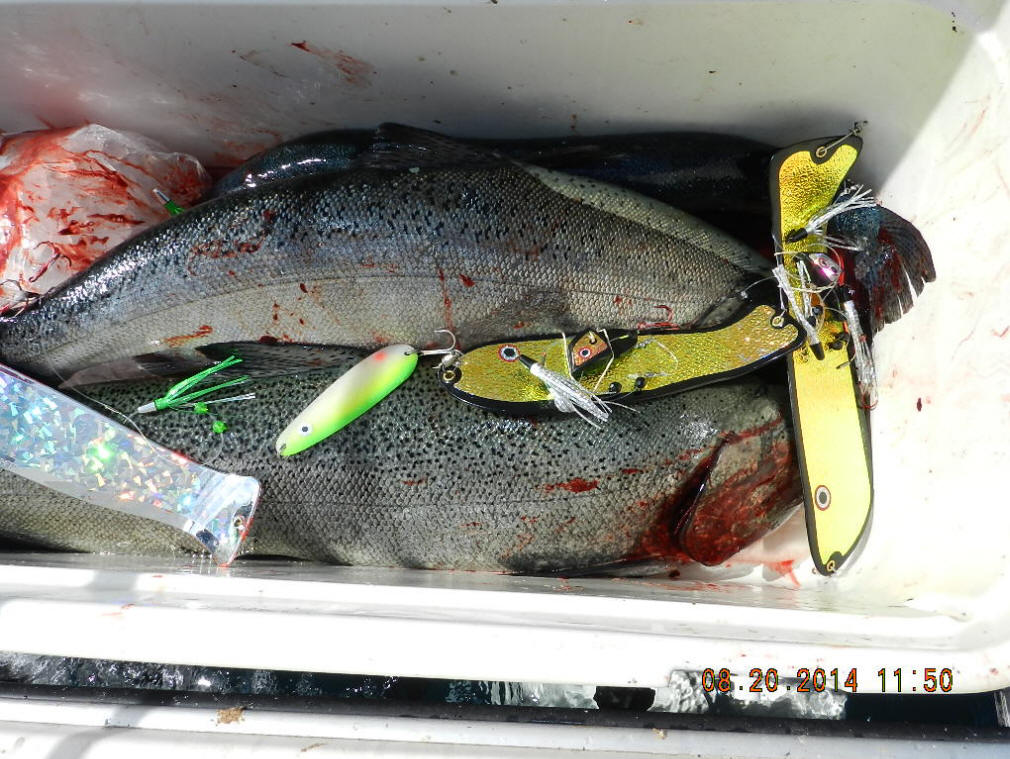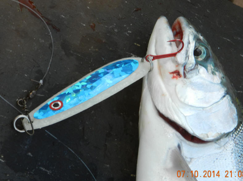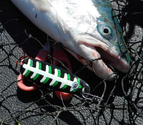 V3.5 TH 4.0 first time in the water on 7/4/14 we hit a double header around 8am. So, I knew right away we were onto a design that showed great promise. Big deal about a double header? ...not really. But in this case speed was 2.5 on the first hit and 1.3 on a dead slow-whoa troll while fighting the first King on a diver. Then, rigger went off while we were barely moving for trolling speed. The goal of having a spoon that works in a sweet spot from 3.0 mph to, at, and below 1.5 mph was verified and was on the right track in the early development stage. This was an alpha epiphany for yours truly! Performance on new Salmon Buster™ Lexan Spoons are off the chart when it comes to slower trolling speeds. Lexan, or plastic used is same as bullet proof glass and has a clear leg up in this area. Brass, the traditional choice in spoons in about a .030 thickness. Brass weighs 4 times as much as plastic, but my spoons are over twice as thick. End result is my spoons are about weight half as much. Salmon Buster spoons DO NOT stall out when you slow down to fight a fish, or allow traffic to clear. Having a spoon that works at slow, medium, and fast trolling speeds is one helluva a tremendous bonus. Especially, when the fish go deep when faster trolling speeds are totally out of the question. Due an exponentially increasing angle, or rigger wire carry back, or blowback the deeper you send the riggers down. Ground Zero Since July of 2003, my only method to fish was pulling meat. Although, I ran a lot of spoons when I was a charter skipper (1983 thru 2003) this was like going to another galaxy in 2014. OK, I had no problem remembering what used to work, but that was back then, not now? Coming up with color patterns, or selections was a blank slate. This led to old favorites like the Yellowtail and Bluetail proving their worth again. Along with more new current colors in my flasher/meat rig lineup, being Black Mamba, Krystal Killer, and SUV that let light transition thru the body of the spoon. Something that NEVER can be done with traditional solid metal bodied spoons! Next to conquer was preferred speed and having a spoon that would entice fish to hit from 1.2 to 3.0 mph. Speed is always a perplexing issue, but found 2.0 to 2.6 is where we got most of our bites and some between 3.0 to 4.0. Speed means underwater signature and how much water is being displaced, causing a fish's lateral line to become involved in the attack and feeding mode. My new spoons as proven in the videos move a lot of water by darting, diving in a constant ever changing more lifelike direction. The 4.0 and 4.65 have their own unique action so unlike ANY regular metal spoon that just go straight and just wobble. Fished with my home built 3D printed spoons from May into October 2014. There were various sizes and shapes tested. Version 5 is what went into production. The good news is the V5 4.65 is that it got bit 100' down and the V5 4.0 took fish at 90' down in what's normally attractor territory. So, it's a given this spoon displaces enough water to have a large underwater signature no matter what the depth is. Underwater signature is a fancy way to describe the appeal to the mega-sensitive lateral line on fish, used to home in on prey, or their next meal. Reverse Osmosis This is important when I proved spoon colors can be transferred to my line of flashers and meat rigs™ and work with equal success! Transmutated cloned the prototype spoon colors of Manistee Mojo and Icy Blue patterns into flasher/meat rig™ combos. Mojo is SUV tape on top, over a black base with a sliver, hyper holo belly. Both of these spoon colors were responsible for P15's first double header on 7/4/14. On 8/8/14 these to transplanted spoons colors to flashers and meat rigs™ proved their worth on 8/8/14 catching both Kings and Steelhead! This is a big deal for the occasional fishermen that fixes the age-old difficult issue of what colors to run. If you have a favorite, or hot flasher/meat rig color combo? ...the exact clone in a spoon choice is a total no brainer. Proven Colors This is another world first! No attractor manufacturer has ever cloned their colors into spoons before. Salmon Buster spoon colors echo exact matches to my flashers and Meat Rigs™ that's been tested since 2004. Glow colors in our ground breaking X-Glow that debuted in 2005, standard lure tape, and our industry leading super X-Glow. Our hyper-holo silver ice-chip tape is a cornucopia of dazzling patterns. Exclusive to my tackle lineup since 2011. Salmon Buster spoons come in a variety of colors. Fluorescent base colors of green, blue, chartreuse, and red. All have daylight light gathering properties. Much like fiber optic rifle sights, the edge of the spoon illuminates as long as there's light available. Proven super reflective, our hyper-holographic lure tape is a kaleidoscope of iridescent hues on a sliver background that must to be seen to be appreciated! This is the same lure tape that's on the top selling Super Silver Bullets and Super Mambas flashers, Meat Rigs™, and meat heads. 4.0 & 4.65 Sizes My new for 2015 spoons are available in 2 sizes. The 4.0 is the regular and the 4.65 would be considered a magnum by most. Unlike competitor's products, both sizes have the same wobble-wobble and lifelike darting action that's exclusive to my spoons. In the videos this darting action is plainly evident at speeds from 1.4 to 3.5 mph. The unique reel-action to this spoon is due to it's light weight, geometry, and patented reinforced outer perimeter. I can say "unique" with total confidence, because we shot side by side videos against several popular spoon configurations from 5 other manufacturers. Click for page 2 with YouTube action videos Click page 3 for instructional log |