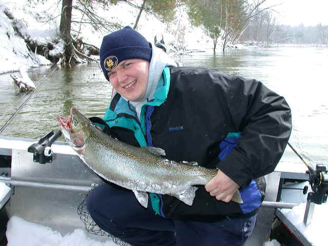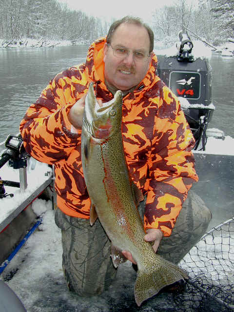 here for Bob's super trophy 3/26/02am I'm fishing today with Bob, the winner of the photo contest who won this trip. We're not gonna start fishing until at least 9am, because of the recent cold spell. While I'm not going the serve any cheese with this whine, I'm at the end of my rope when it comes to this prolonged wintry weather we're experiencing this March. I'm not going get snow blindness, or willing suffer from hypothermia in quest of Steelhead on the Big Manistee River anymore this year. I hope my sentiments echo yours, because this winter stuff has lasted way too long! 3/25/02