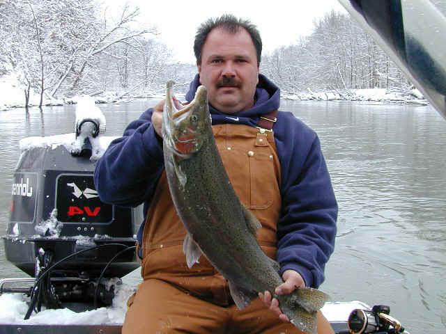 with. 4/4/02 Today was not my day! Although, we had 2 line ripping strikes, neither one stayed hooked up for very long. My guests were Pontiac Fireman, Kelly O'Brien and his 10 year son, Patrick. Kelly was more than nice enough to bring his "famous" pineapple upside down cake, but the Steelhead weren't benevolent to us at all. We fished from about 8am until noon, and slow fishing meant, I wasn't going to push Patrick's patience switch to the limit. Then my brakes let go at the boat ramp, just to make my day even more miserable, not to mention the $$ repair bill. 4/3/02
