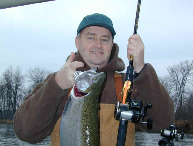 beat up on any one "hole." 11/28/01 Wet, rainy and damp best describes the weather here in Manistee County. Be fishing tomorrow, so look for new pictures and fishing report on Thursday. 11/26/01 Plans for this week include taking Mike from Manistee Auto Electric fishing this Thursday. Dec. 2 and 3 Capt. Len Mitchell from Lucky Charm Charters will be my fishing partner, along with his wife Anita. Reports from the river remain rock-solid. 11/25/01 Fishing for Steelhead in the Big Manistee River is fairly decent, depending on the crowd. As far as I can see, we have more fish available at this time of year, since 1996. To see the reel inside story on the lures I've been using and how to tune them click on: Flatfish Tuning. Fishing should be "Hot" this week with the recent rainfall. Life is good in Manistee County. 11/24/01