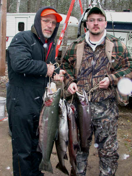 here for Barry and Rich's most excellent mug shots 11/21/01 Getting ready for the annual Thanksgiving fishing with Barry Pines is at the forefront today. Tying up loose ends on the Cherokee winter storage project is what I plan to accomplish. Steelhead fishing in the river should be good. 11/20/01 I've been on a 2 day downstate quest searching tackle outlets for the 4 hook model of the T-4 Flatfish. I found some new colors that should work fine in the Big Manistee River. I'll be returning to Manistee County early tomorrow morning. Angler supreme Barry Pines and friends will be my esteemed guests for the next 3 days of the Thanksgiving weekend. 11/16/01