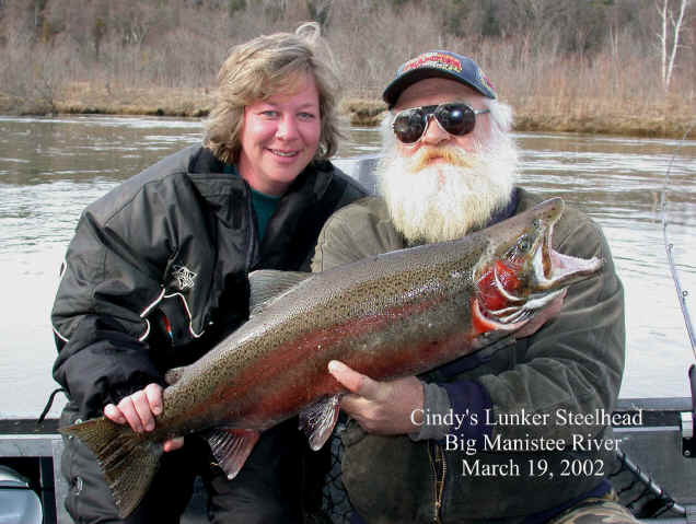 jury rig the flap-gate valve on the jet-pump. 3/25/02am Woke up the Cherokee from it's very long winter's sleep. I took it home from the heated storage building in Wellston I use. I'm on the river everyday this week, so check back later for results. My guest today is Gene Commire and I'm hoping the brutal butt whipping the Steelhead took over the weekend don't completely shut the fish down. We need a few Steelhead to strike.....reel fact! 3/24/02 I went to the zoo at the High Bridge boat launch on the BMR today, at about 3:30pm. There was at least 25 boat trailers with no place to park. The word "heavy traffic" doesn't describe what I saw. Mailed several lure and snubber packs in Manistee also. Let all hope, the winter-like conditions we've been experiencing will break towards spring reel soon! 3/23/02 Catching up on this weeks tackle orders and a trip to the Post Office is in store for me today. My 28 foot Cherokee comes out of it's winter storages long nap. Next weeks weather in Manistee County looks much better that what we've experienced this week. They're calling for temps approaching 50 by next Saturday. 3/22/02