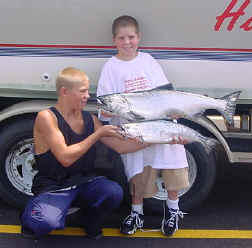 who did not participate! Best Sportsmanship Awards "Best Deal" earns the hard luck and best Sportsmanship Award for making sure his 12 pound Brown Trout made it to the weigh-in, even though he had motor problems and couldn't fish the complete the full 7 tourney hours. "Never Enough" had a no show for a team mate, something I wasn't aware of, until it was too late to rectify the problem. Me being the floating boat might have teamed with them at the last minute and have added 21 pounds to my catch. I'll let you do the math, so there'll be a Best Sportsmanship Award going to this team also. Thanks to the entire crew of the "Never Enough" for not raising a big stink over this issue. I need this team to E-mail me, so I'll have an address to mail their award plaque too. Would I do It Again? The way I see it, it's up to you. Even though I was over-run with at least 10 people staying at my place, I was happy to share what little I do have with them. Some of the responsibly for purchasing the food for cookout needs to be shared to take some of the "heat" of me. Other than that, I fished many tournaments and seen ours was efficiently run, especially for a first time outing. The chance to met many of you and swap stories was more than fun. Now to answer to the question, of would I do it again? "Of course, with your help!" Contact me at: kingscharter@yahoo.com for feedback. or post a message at: Capt. John's Message Board 2003 Planned Changes Next year a member from all registered