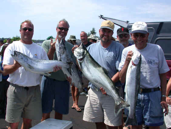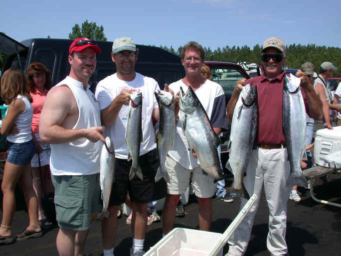 1. The best catch was caught slightly south of Manistee (10's to 12's) on the "shelf" 2. Free sliders and mono high divers took all my fish. 3. Even non-fish eaters raved about Capt. Mark Pefley's "Famous Fish Boil" 4. A no show of "Wet Net" caused "Never Enough" a lack of a team member 5. Bang-a-Rang took big fish honors with a 26 lb. King and the best catch awards 6. A number one Fishlander in the yellow-blue dolphin took all my fish 7. Out of town winning boats need to contact me at: kingscharter@yahoo.com 8. The winner shared all info and at all times from what I could gather 9. I weighed in 54 pounds solo in 4 fish, but I ran 9 rods and had disqualified myself, because I was a on charter and didn't have a team mate to jeopardize, or at least at the time I didn't know I could have.