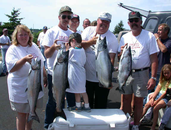 Hammer Time Lake Michigan was a tough customer to fish during the tournament, as we started the deal with light southeast winds at 7am. Late this last Thursday afternoon (7/4/02), the lake rolled over and brought the thermocline up to about 25 feet from 75 feet. A major change like this scatters the fish and makes fishing extremely difficult for everyone. However, the participants were up to the challenge and all did a fine job in adjusting to the tricky circumstances. The target specie of the tourney, King Salmon while scarce, did manage show up at the weigh-in in almost all of the teams fish boxes. The Podium Finishers Cooperation was paramount to the winning team of "Dottie Kay" and "Bang-a-Rang" and worked out a good plan, earning in my opinion the title of "World Champions" until the 2003 competition. Second place was taken by an outstanding effort by the team of "Capt. Morgan" and "The Office." Also, earning the last podium spot was "SpoonTang" and "Jamie Lynn," as Ludington and Bear Lake combined to weigh-in the third best shared effort award. The theme of camaraderie, sportsmanship and a good time was maintained throughout during our friendly clash of knowledgeable Great Lakes captains. Not once did I detect any airs negativity, or arrogance from any of our entrants. We had at least 200 people at the weigh-in and we served about 60 hungry fishing people around 6:30pm. This was the first year and it was a learning experience for me. The weigh-in part went very smoothly, but the delay time to feeding everybody was too slow. I've had some volunteers (Doug from the "Spoon Tang" and Dick from the "Sunrise") for set-up shore duties and cooking while the fishing is underway. This will mean food can be served at the conclusion of the weigh-in, meaning dinner will be served at 4 pm and shorten up the afternoon considerably. If there's enough positive feedback, and I think there will be, we can do this again in 2003. My Gratitude to All Thanks to "Imoffduty" Craig for