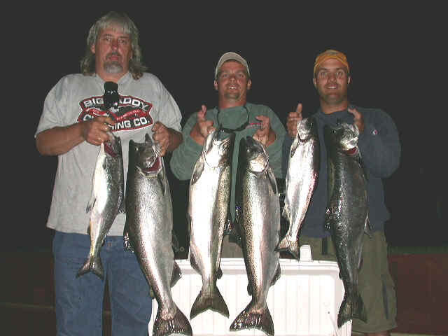 7/14/03  We successfully completed my first 2 day "on the water" seminar for 2003 yesterday.  The group was comprised of Keith, Ken, Bill, Darrell and Clyde.  We caught fish both days, including a couple of Kings from 13 to 22 pounds.  I view these Kings as scouts of a recon mission from the main swarm of Kings that will soon,......hopefully, show up!  We boxed 6 fish (2 Kings & 4 Lakers) for about 10 hours of actual trolling time with lines in the water.  Please keep in mind, this was for an evening and morning, so by any means, we didn't tear the fish up.  What hurt us yesterday morning is that we missed far more strikes then fish caught.