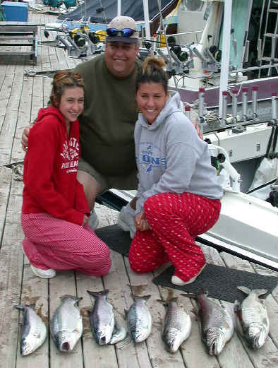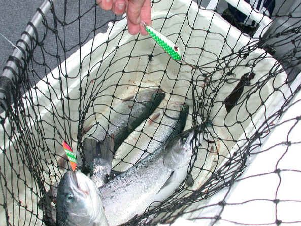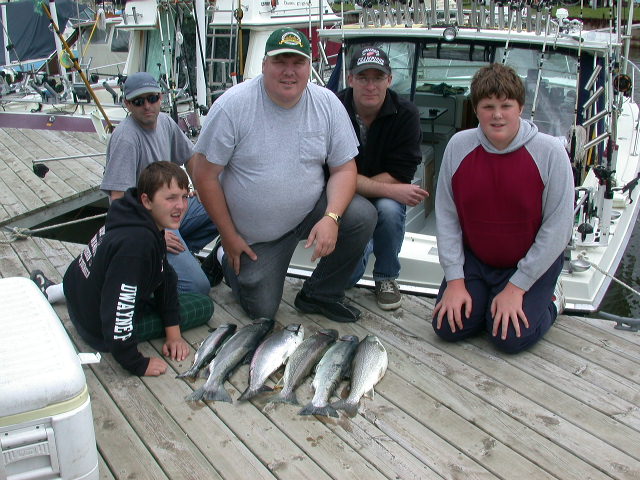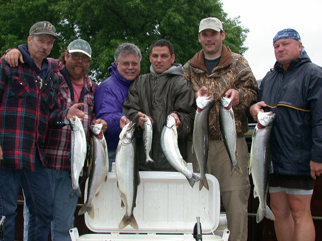6/9/03pm  Kinda struggled our way into boxing 6 fish yesterday morning.  I got to the boat around 6:00am and was greeted cold drizzle, that turned into a all-out hard rain.  We trolled towards the deeper water (450') in search of better action, because shallow stuff (100' range) didn't show us much.  Flat calm seas didn't help our cause one bit.  We had 8 strikes (6 off the "birds") and my crew landed 2 Lakers, 2 Steelhead and 2 Kings.  Almost of the fish were in the 6 to 8 lb. range.   Click here for the group's dockside photo