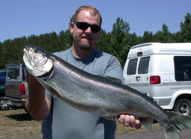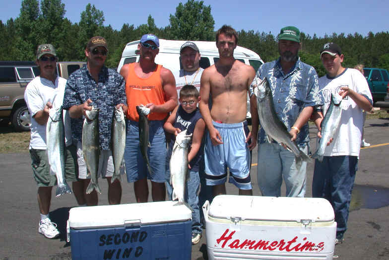 7/7/03   Fishing kinda made a leap forward yesterday off the Port of Manistee.  Team "HammerTime" (Mike & Chris) landed 9 worthy fish, including a Master Angler 22 pound Lake Trout.  It was relayed to me they lost more then just a few and had good action throughout the day.  The interesting factoid about Mike and Chris's jaunt is they didn't even leave the dock until after 8am.  Factor in they ran only 6 rods too!