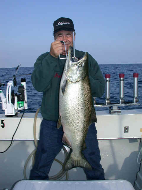 My observations on these seminars is, "I don't care how many fish we boat, as long as the anglers pick up helpful techniques that will prove a bonus down the road."  We really didn't have a hot lure, other then a green hornet, and our lure selections were pretty much across the board.   This I can say, "the fish were extremely scattered (120 to 600 feet of water) and no one place was better then another."  Tough best describes what went on for the entire fleet this past weekend.  As an interesting side-note to this event, Keith boated his largest King ever (22 pounds)!  Both Keith and Ken are a dedicated father-son fishing team that harass the Lake Huron waters off Harbor Beach on fairly regular basis.