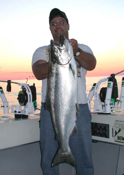 7/18/03 1pm Update:  Had a fairly decent brief morning trip with Bill, who recently returned from a Alaska fishing adventure.  We dropped lines on the fish at 6:30am in front of Onekama.  Within 5 minutes we were into our first King of the morning, with Bill landing his first Great Lakes King (a dandy 10 pounder).  Bill being from Arizona was amazed at the brute strength that fish exhibited.  It wouldn't be long before another larger Salmon whacked a diver rod and that fish was around the 15 pound area.  We lost a fish, right at the boat, then Bill tied into a good 20 pound adult King with a nasty lamprey attached.