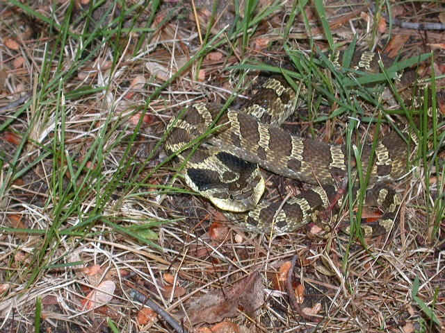 I know this has absolutely nothing to do with fishing, but I found a weird looking snake in my back yard.  Click here to see the close up of snake  When I poked at it with a stick it coiled up and flattened it's triangular shaped fear-some head.  I seen no rattles on it like the Eastern Massasauga Rattlesnake.  This snake was about 24 inches long and blended into it's surroundings with natural camouflage.  If you have any idea of what type of critter it was E-mail me at kingscharter@yahoo.com