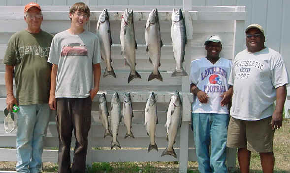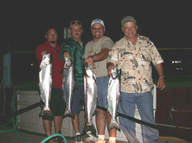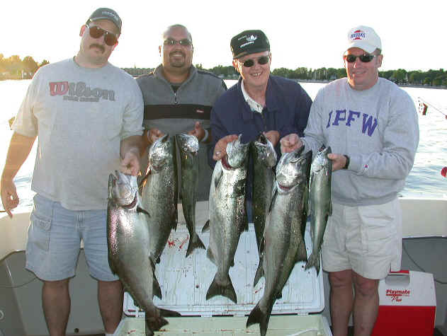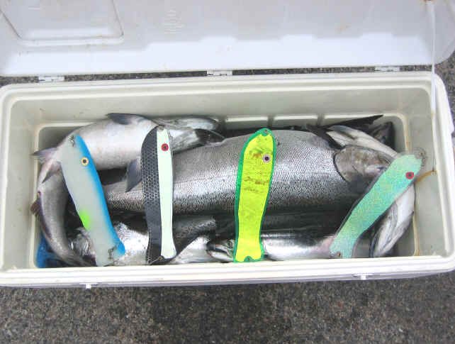 The fish were on a tear! The Kings were all over the darker colors and some colors I would never have guessed. It was black gold and black red, which may have something to do with them being so high in water column. We ended the day at noon as another storm with rain and 60 mph wind chased us off the lake. We had 11 Kings with 6 being 4 year olds, and 4 nice coho. After a mediocre June, July is off to a huge start".........Capt.