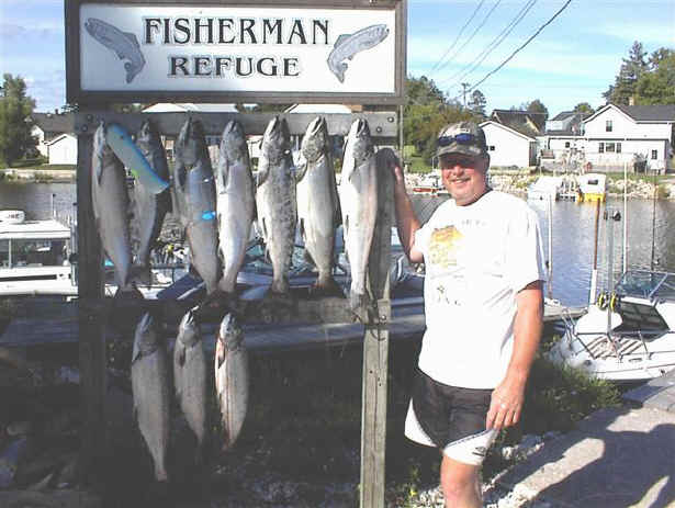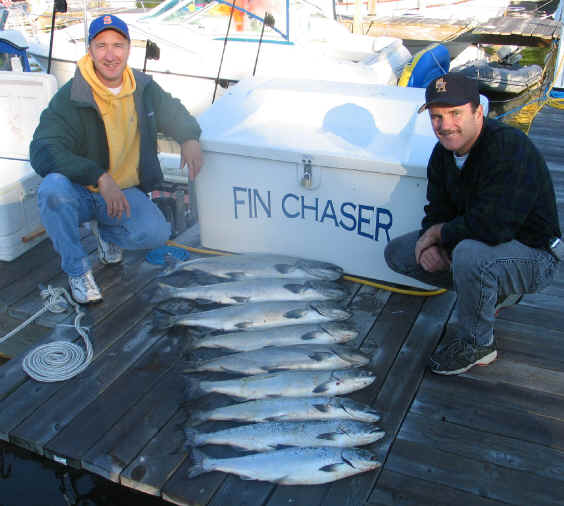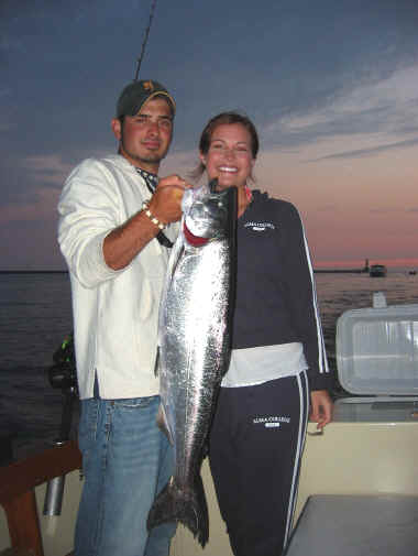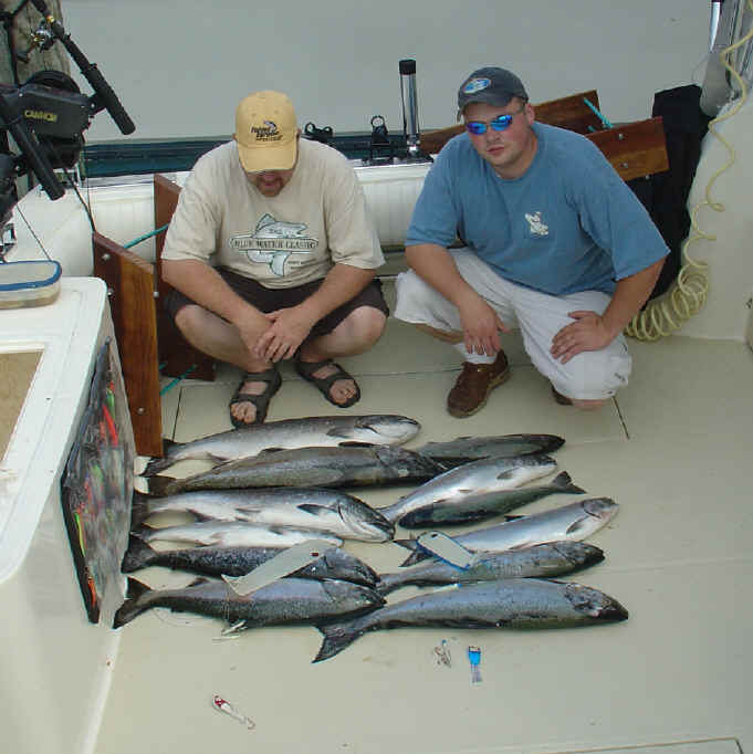 ....we went with only set 6 rods. Four with meat and two boards with spoons. The two dipsey rods were 70' and 80' back on 3 and the riggers were 28' and 35' down. We were seeing the temp break at 25 feet down. It went from 66 on the surface to 48 only 30 feet down.