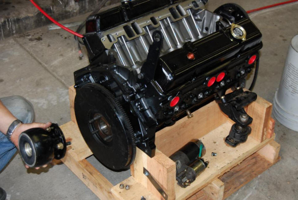Click new GM small block V8 motor being installed