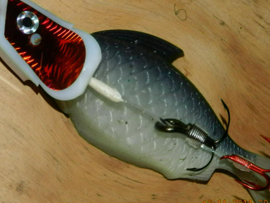 12/11/11  Yesterday's photo showing the rubber fish rear toothpick is strictly a demo for when I hold meat school in my shop.  Meat school is for those new to fishing meat and is done by appointment only.  In less then 5 minutes all can be explained.  This aids my customer's confidence level and gives them a leg up.  Showing them first hand there is absolutely no learning curve. Click for toothpick & rubber fish demo