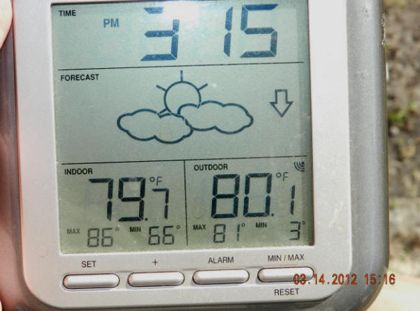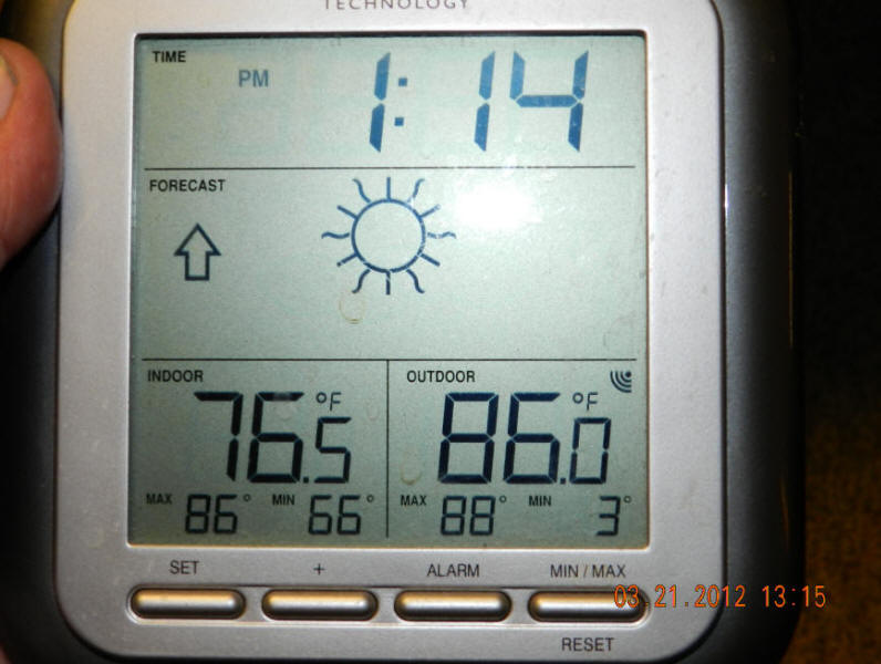 3/22/12  High temp yesterday at my place hit a sweltering 87-88 degrees.  To me this is too hot to work comfortably outdoors!  Click 86 proof at my place!