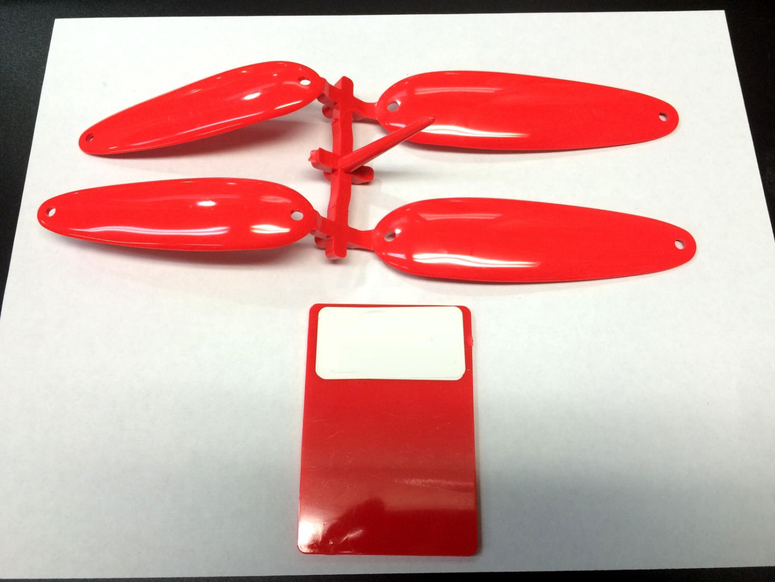 Today's pic shows how the spoons come out of the mold.  The part joining the 4 spoons together is known as the tree.  The tree provides a path for the Lexan™ plastic to flow, ...at over 600 psi.  This intense psi pressure makes the heat that melts the plastic, as it's compressed into the injection mold.  Click new spoons on a tree