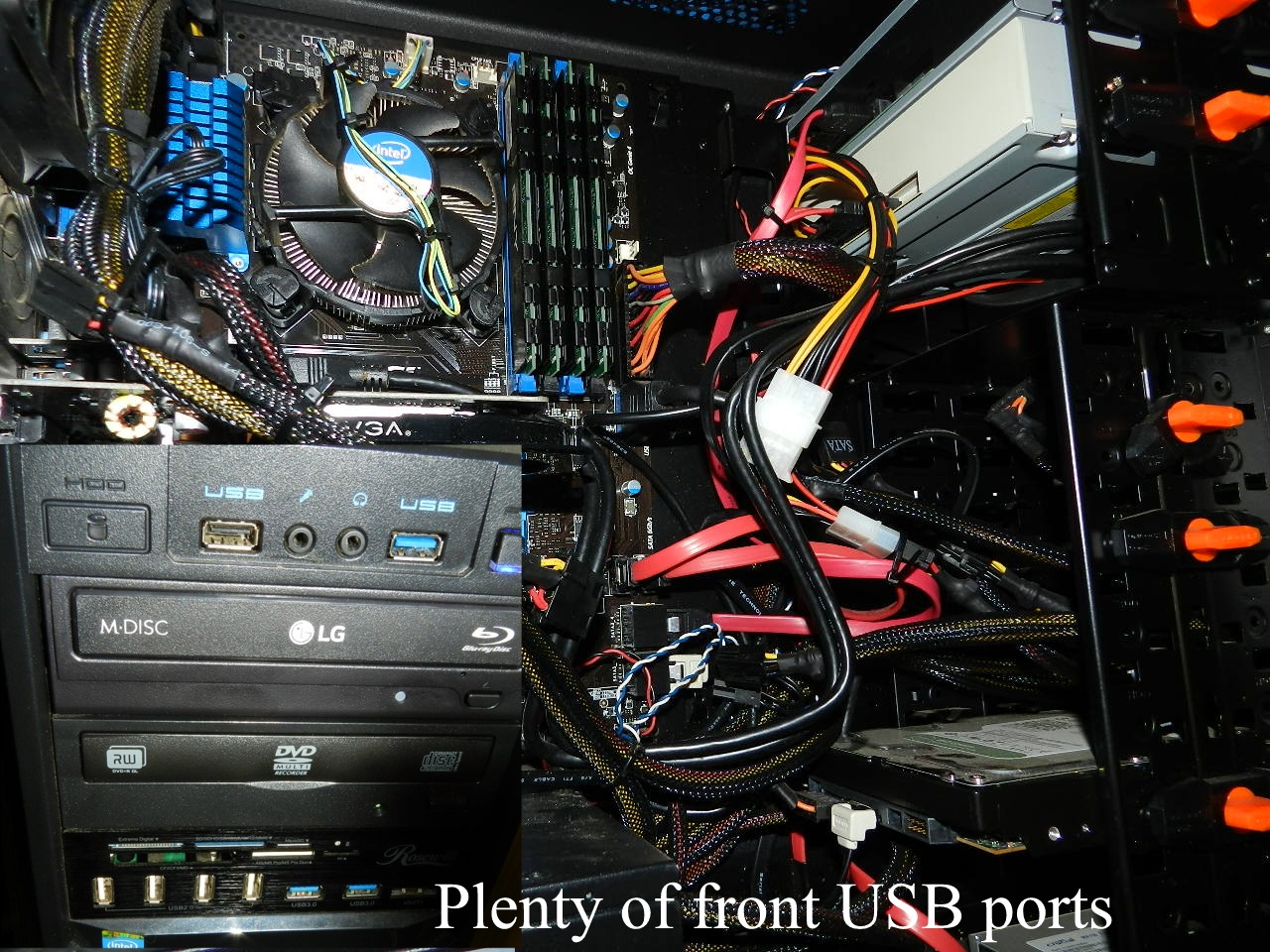 Great feature is the 5 front mounted 2.0 and three 3.0 USB ports.  It has card reader for opening action cams/camera media sticks & thumb drives.