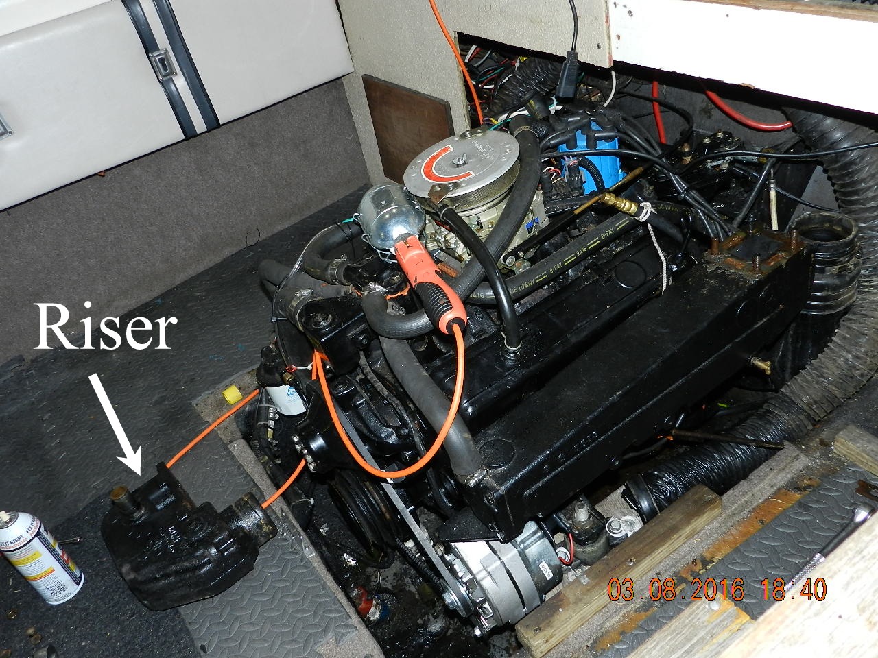 Began in earnest to install a closed cooling system on my 1979 22' Sea Ray's GM V8.  Pulling the 35 year old exhaust risers was a difficult job and a half.  Risers are on your exhaust manifold to prevent water from entering the cylinders. Click manifold riser