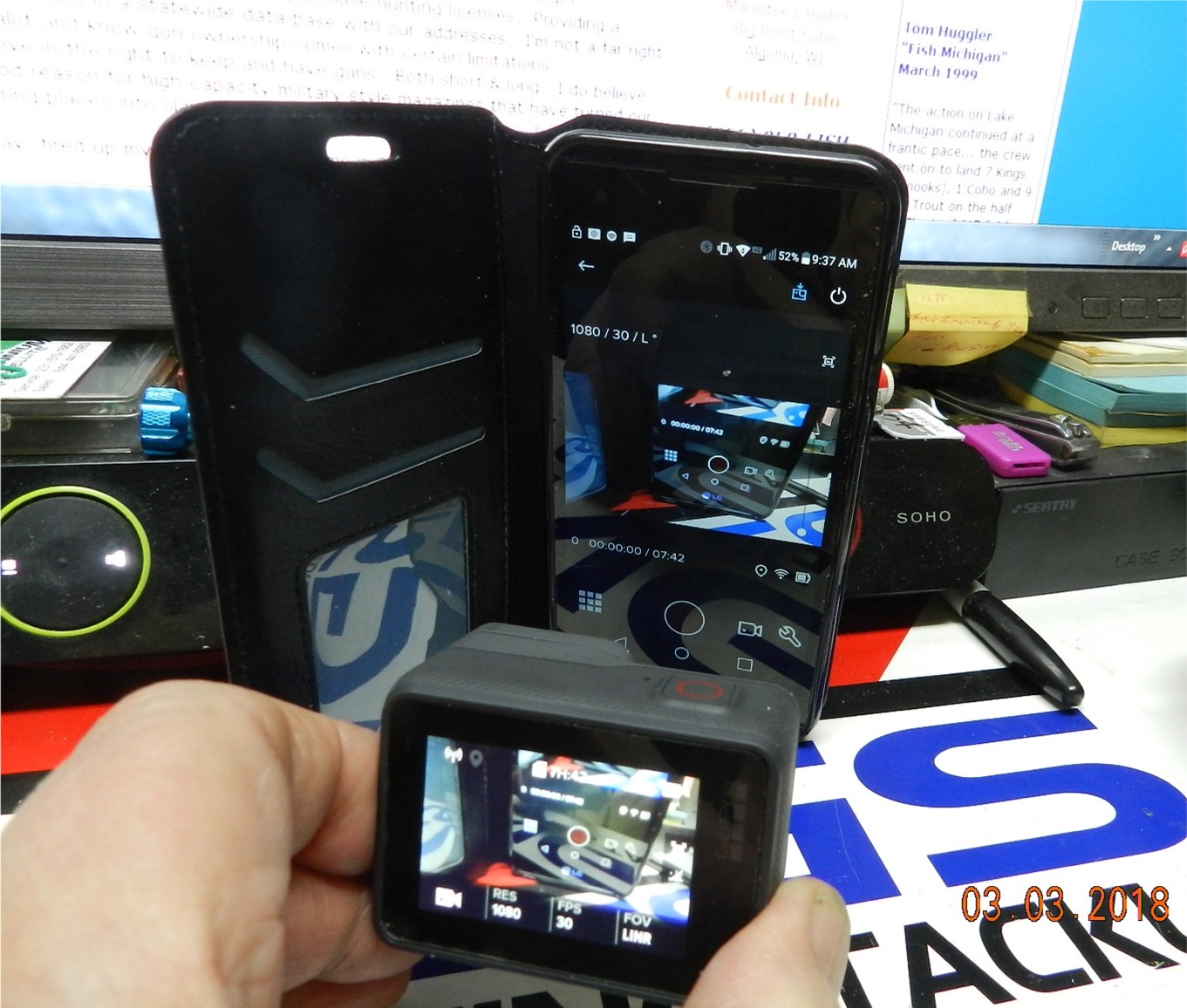 3/4/18  Posted a photo that shows Bluetooth connectivity between a GoPro Hero5 and an Android cell phone.  Great feature ...right?  Yes, but it will flat out drain your cell phone's battery in a big hurry when using it for a control/view screen.  That's one of the reasons I installed the 4 extra USB charging ports in my boat. Click camera/phone connection