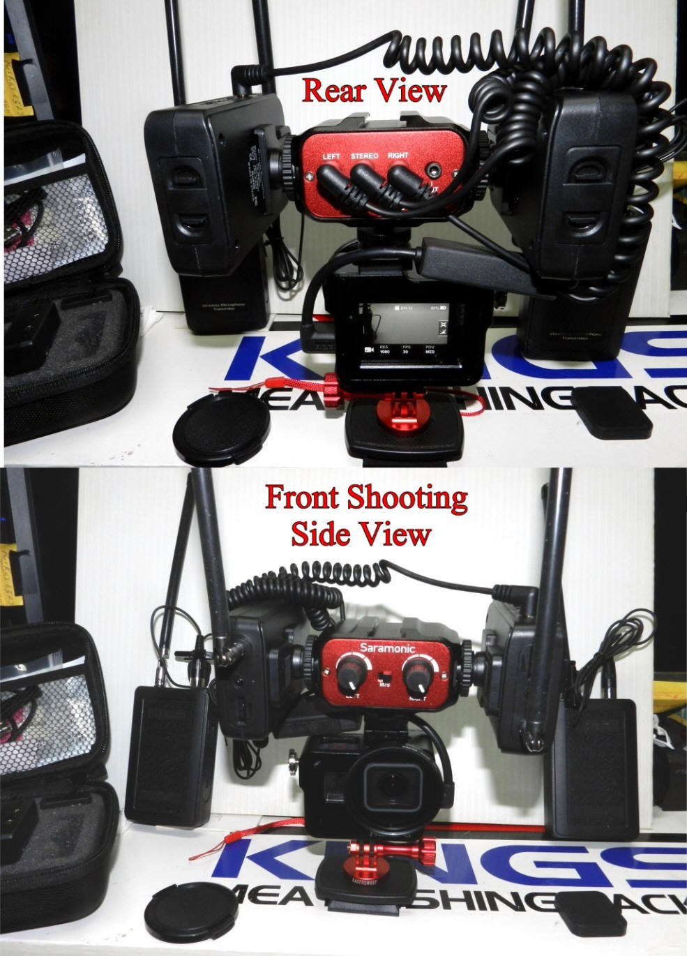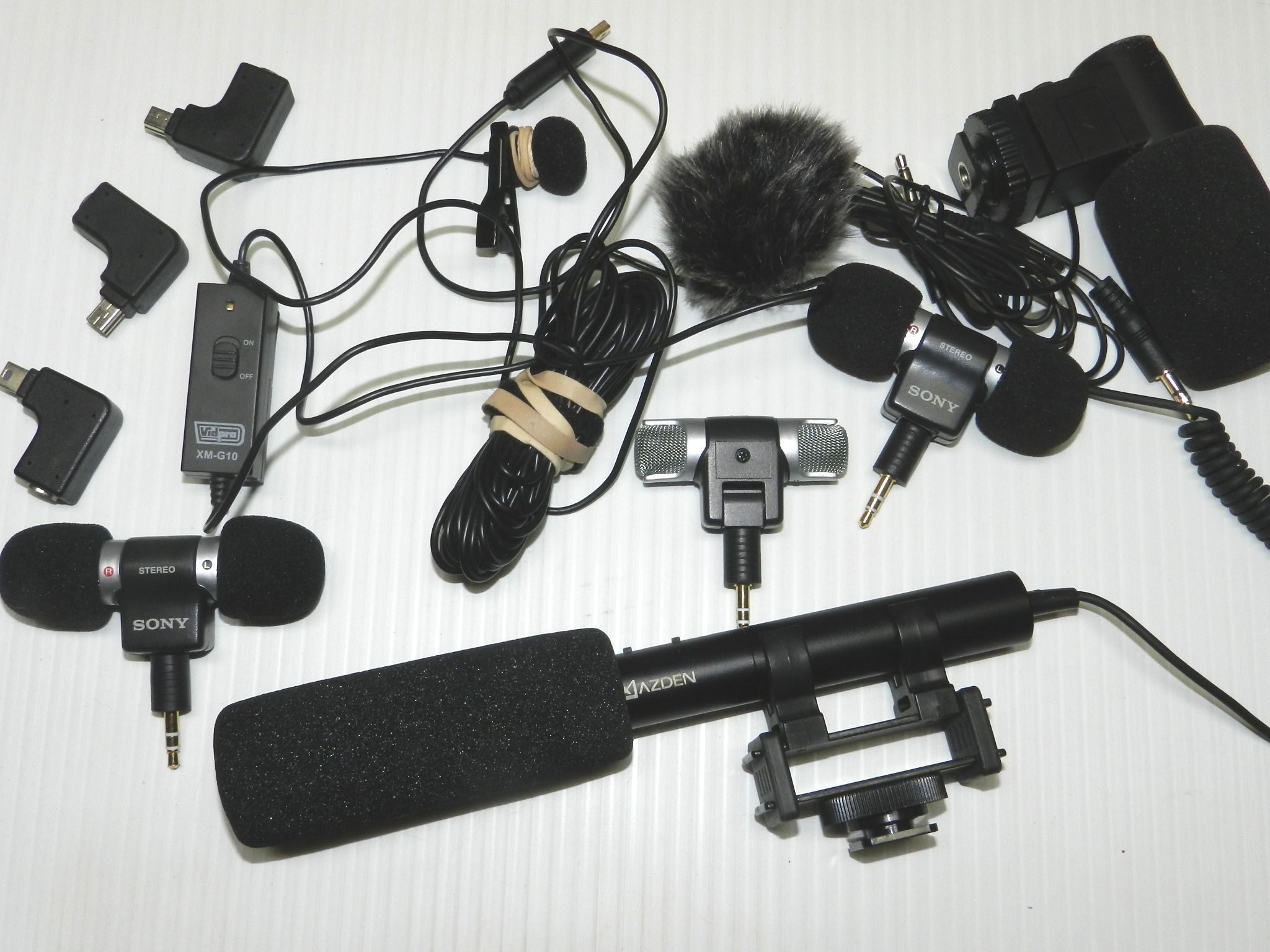 Today's featured photo show the wide variety of action cam mics I've tried over about the last 10 years. None of these mics are expensive, most are in the 5 to 20 buck range.  Only the large Azden shotgun