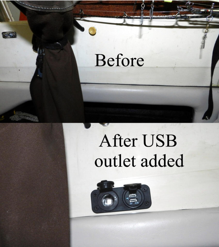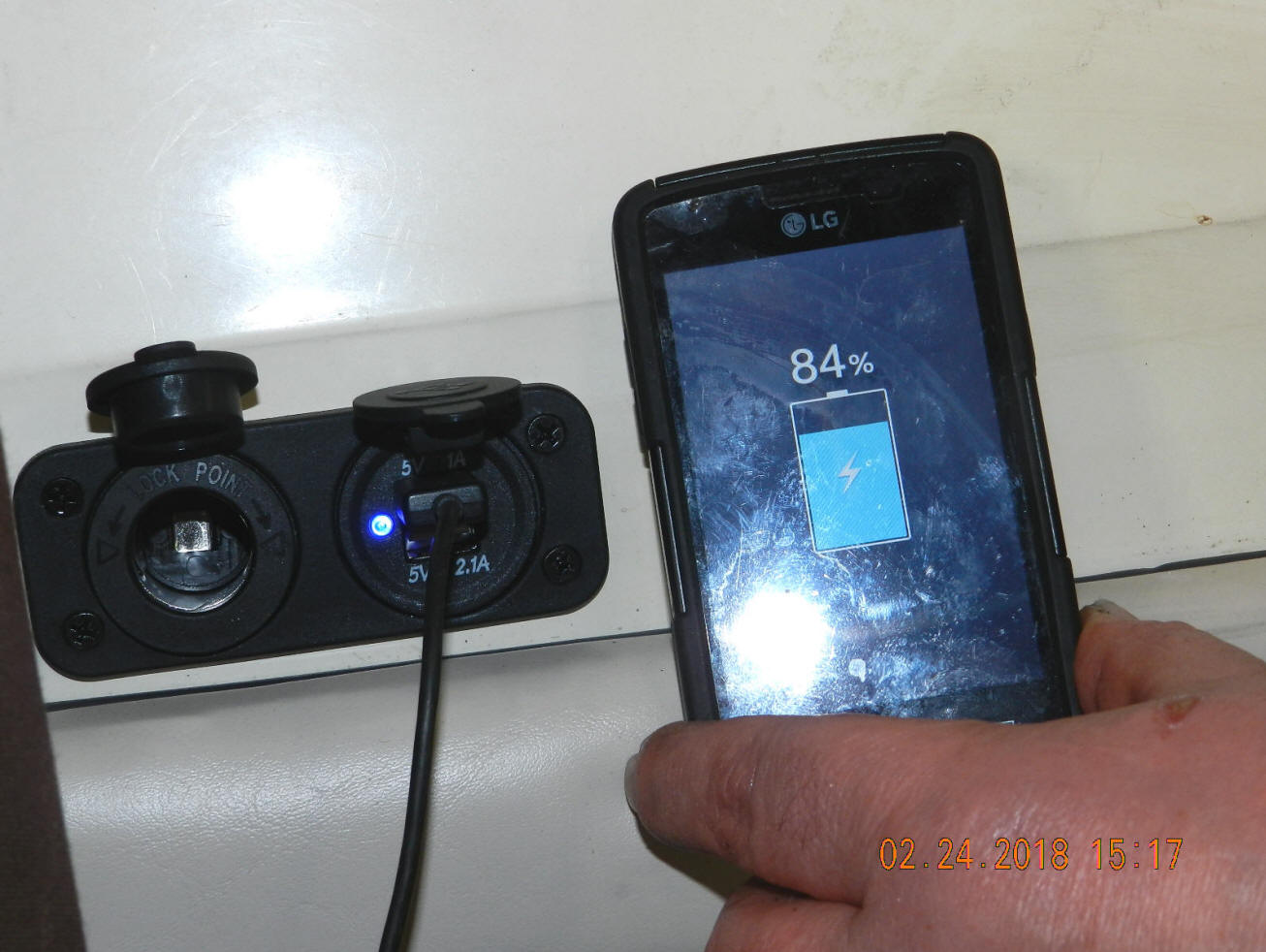 2/26/18  All 2018 boat upgrades should be done today.  Including a new LED combined red & green bow light.  Today's pic is cell phone being charged aboard thru USB outlets.