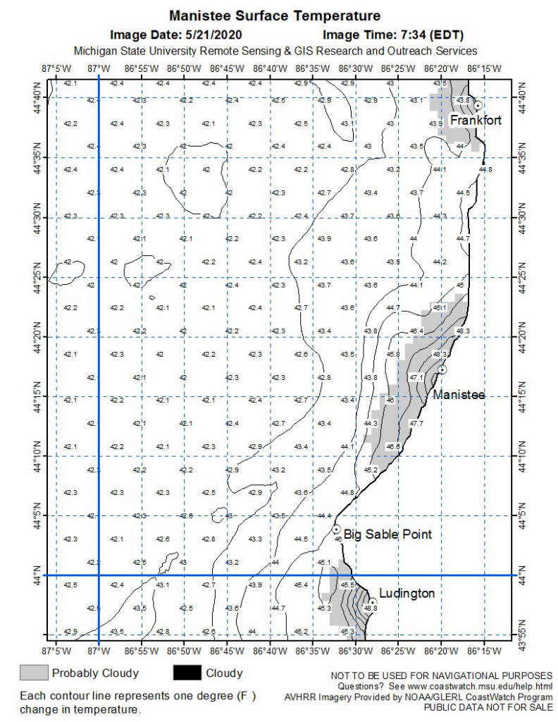 5/29/21  Welcome to Memorial Day Weekend 2021.  Weather is cool with frost warning for Manistee, MI.  Lk. MI looks decent to fish.  Sorry have no reports to share.