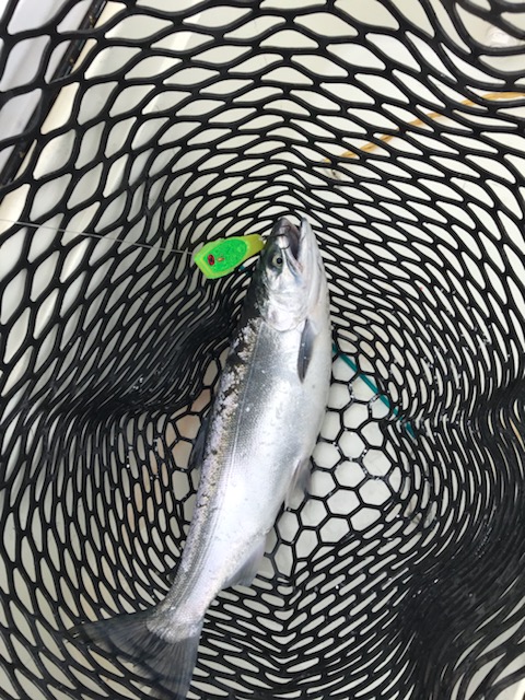 Today's featured photo is from Tom M who fishes this area.  His first Coho came on a X-Glow Green Strip Teazer.  Tom said this bait wasn't in the water for 10 minutes when a 4-5 pound Coho met his fate.  The growth rate of these Coho continues to amaze me.  What was a 16-17" Coho 2 months ago are now pushing 5 pounds.