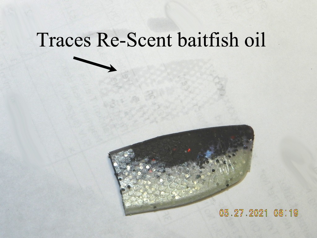 Outcome is obvious with the top 2 being reduced in size.  Found out from the manufacturer, too much fish oil will remove the plasticizers in the soft plastic.