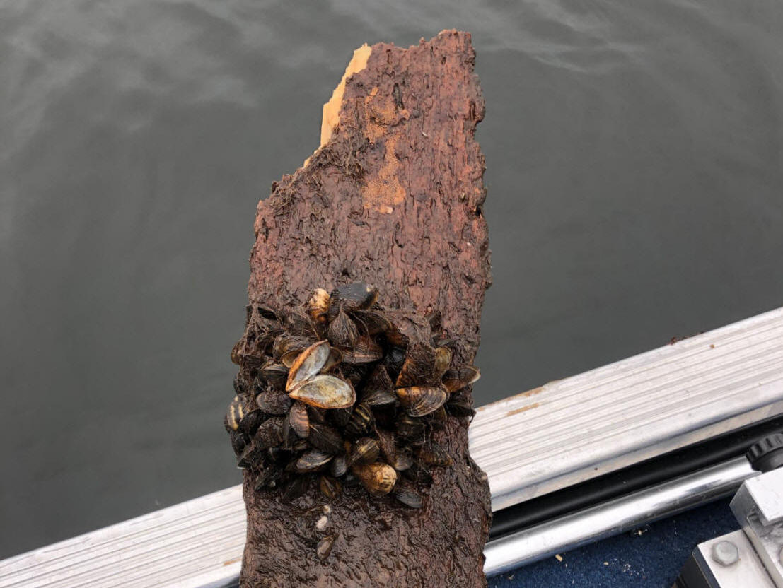 "This piece of wood is probably close to 150 years old. It was part of a “slab” dock that had been used for processing wood.  Slabs were wood that were produced while processing good wood.  Click piece of 18th century slab dock