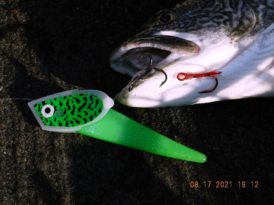 7/7/21  Longtime friend of this website, WI's Steve B. had 5 hits on his wire diver towing our Black Mamba Glo Strip Teazer.  Good news is after being punished 5 times, the strip came out unharmed.  This is testament to the durability built in from last year's tests.