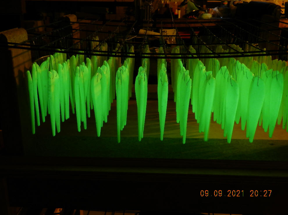 9/10/21  Today's focus is on prep for the 2022 season.  Made close to 200 XG King Kryptonite Strip Teazers a few days ago.  Click for this glow in the dark pic