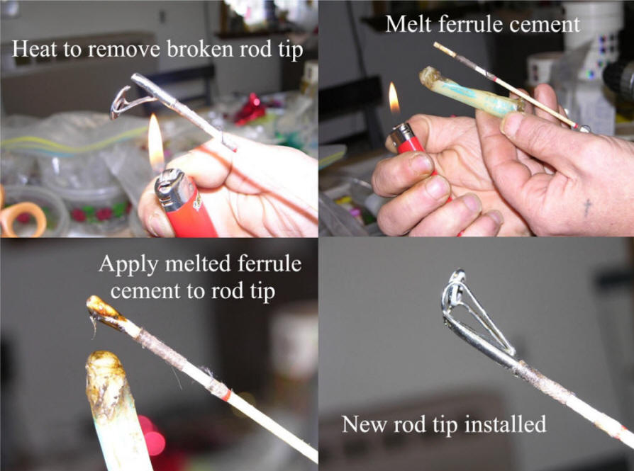Extending the life of your fishing tackle makes cents.  Cents that add up into dollars over time.  With 5 to 10 minutes of your time and a few backs you can fix a worn, or broken rod tip.  Most quality tackle shops carry a wide assortment of sizes to replace rod tips.  Just purchase some ferule cement that's used with a heat source and you're all set.  The above image explains the rest.  Scrap off the old cement, smear some heated glue and install the new tip.
